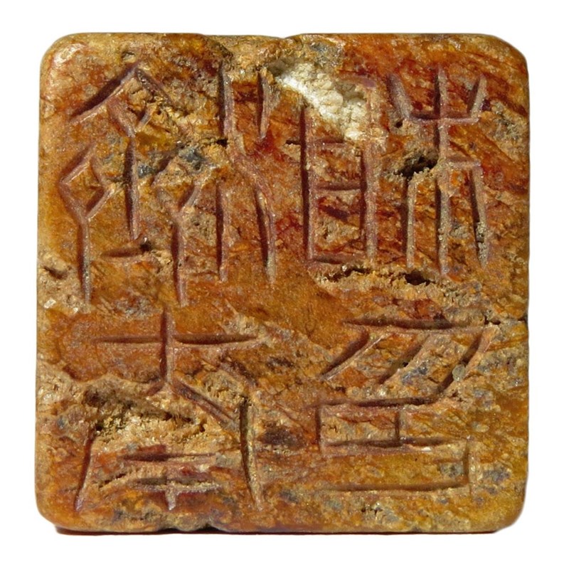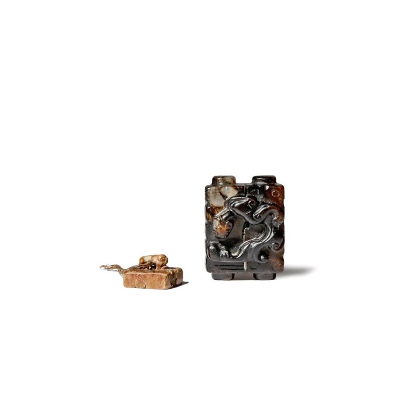 Carved to one side with a sinuous chilong, the vases with rectangular-section designs, and a miniature jade four character seal, the stones in celadon, grey and russet-brown, 3.8cm max. (2)