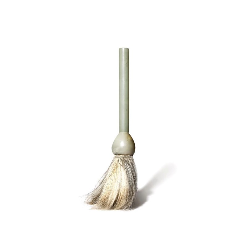 The cylindrical handle with a bulbous terminal and with horse hair bristles, the box with paper labels for the Sze Yuan Tang collection, the jade 13.5cm, 21.5cm overall. (2)