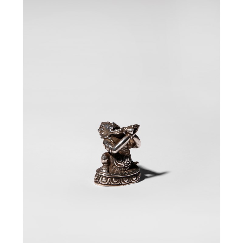 The wrathful figure squatting on a lotus base, holding a ghanta and a vajra in vajrahumkara mudra in front of his chest, wearing a garland of skulls and a skull tiara, the head tilted backwards with mouth agape revealing his sharp fangs,130g, 5.3cm.