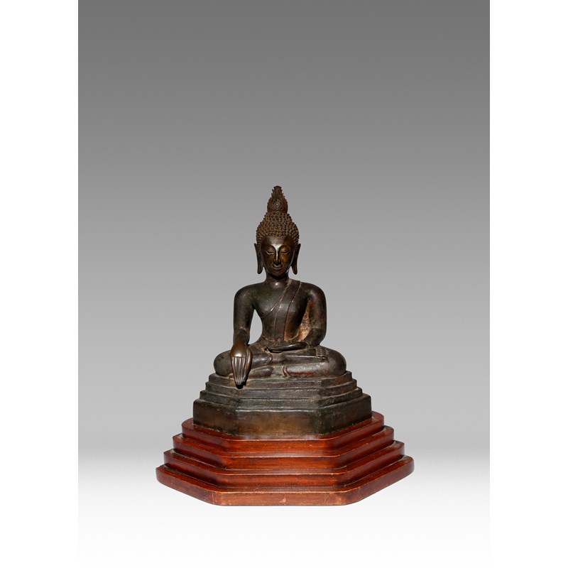 Seated on a high stepped plinth in dhyanasana, he holds his left hand upon his lap in dhyana mudra and touches the ground with his right hand in bhumisparsha mudra, wearing a samghati, his hair in tight curls rising to the ushnisha surmounted by a flame, a wood stand, 15kg, 54cm, (55cm overall). (2)
