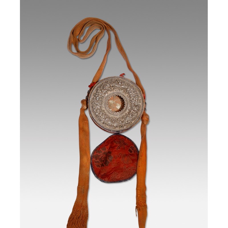 The cylindrical body decorated in relief with the bajixiang, within a beaded border, the sides and base copper, and mounted with a woven shoulder strap, 30cm.