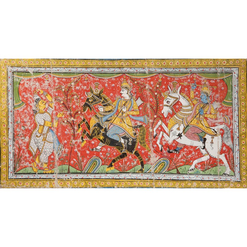 Depicting two horse riders, possibly Lakshmana and Rama, dressed in courtly attire as they encounter a dancing maiden wearing a flowing sari, the scene painted with niryas kalpa against a bright red ground, framed by bands of floral scrolls on a white and a yellow ground respectively, 41.8cm x 82cm.