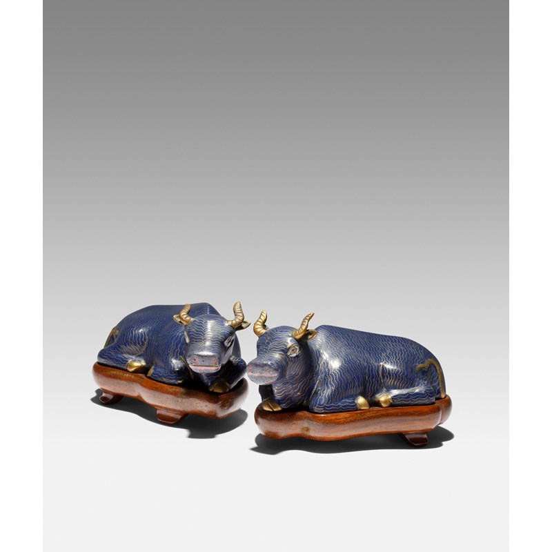 A PAIR OF CHINESE CLOISONNE MODELS OF WATER BUFFALO