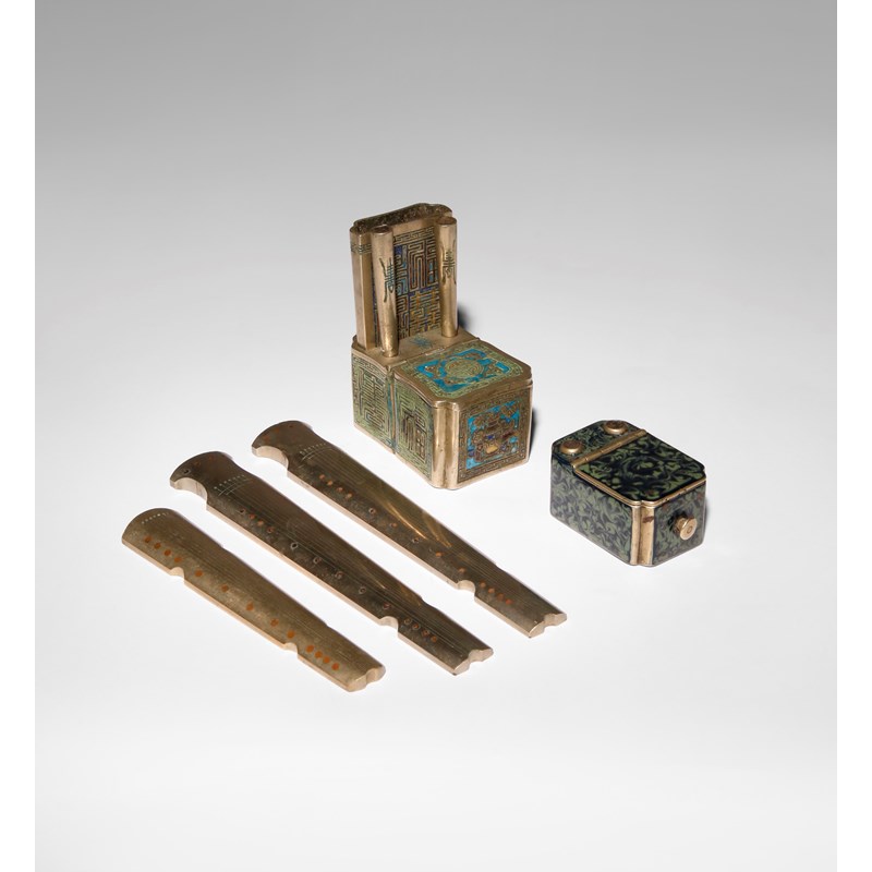 Each shaped as a qin, together with two baitong and enamel ink wells, one with removable compartments, one inscribed fu xi shou lu, 976g overall, 17cm. (8)