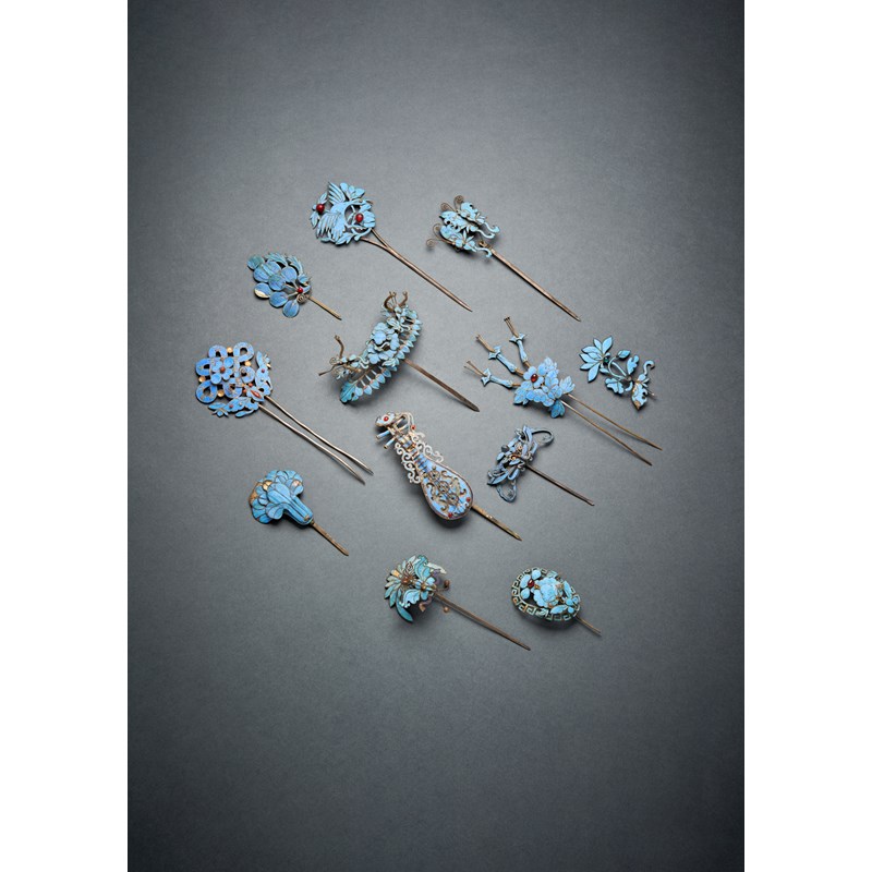 Variously shaped as butterflies, blossoming flowers, a bird, an endless knot and a Chinese musical instrument pipa, some embellished with hardstones and simulated pearls, some spring-mounted, one with a paper label for Jehanne de Biolley, Oriental Art, London, 19cm max. (12)