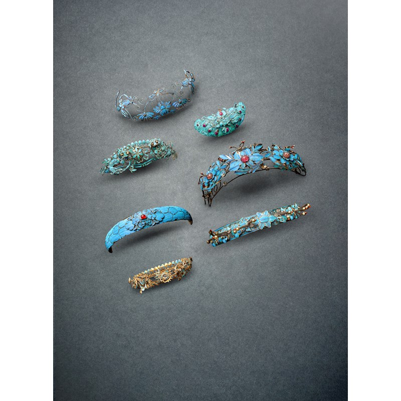 Comprising: three head bands and four plaques, Tianhua, variously decorated with butterflies hovering above blossoming flowers; a pair of lion dogs and brocade balls; a pair of dragons and a flaming pearl compass; and a goldfish, each embellished with kingfisher feathers, four with coloured hardstones, 21.7cm max. (7)