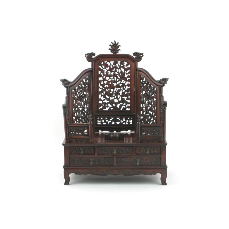 A Chinese huanghuali small throne or mirror stand, probably 19th century. The top rail decorated with a flaming pearl and with dragon head terminals, the back, sides and front rails set with reticulated panels carved with birds and kylin amidst foliage, the front with an arrangement of five drawers and carved in relief with further flowers and scroll work, 74.5cm high, 54.5cm wide.