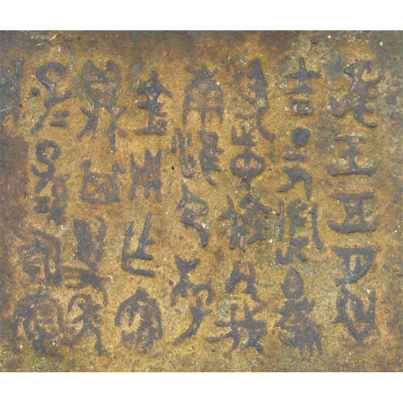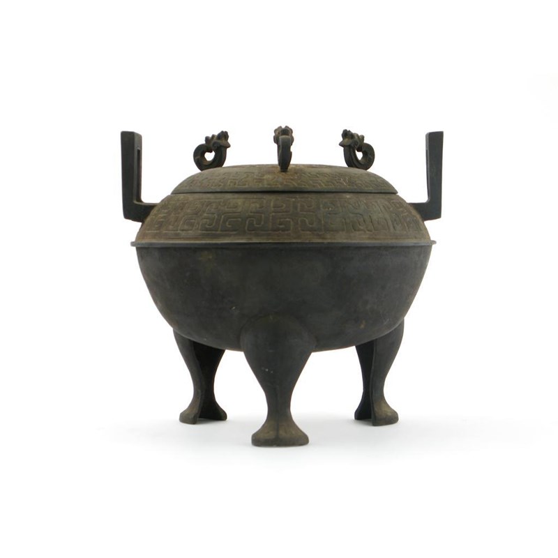 A Chinese bronze and silver inlaid ding and cover, probably late Ming. The compressed circular body with angled handles, the lid with three animal ring lifts which become feet, the shoulder cast with a stylized geometric band, the interior of the vessel and the underside to the cover cast with characters, all on three tall feet, 27cm across. (2)