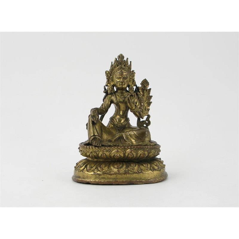 A Tibeto-Chinese gilt bronze figure of Green Tara, 18th century. Seated in lalitasana and raised on a high double lotus throne, the aureole lacking, 16.5cm.