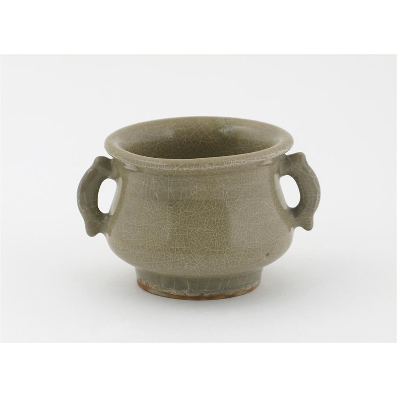 A small Chinese ge-type incense burner, perhaps Song dynasty. The circular body with a light crackle and handles to the sides, some old restoration, 11.5cm.