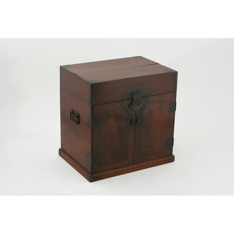 A Chinese huanghuali seal box, 18th/19th century. With a hinged lid and a pair of doors enclosing an arrangement of five drawers, damages, 35cm high 34.5cm wide.