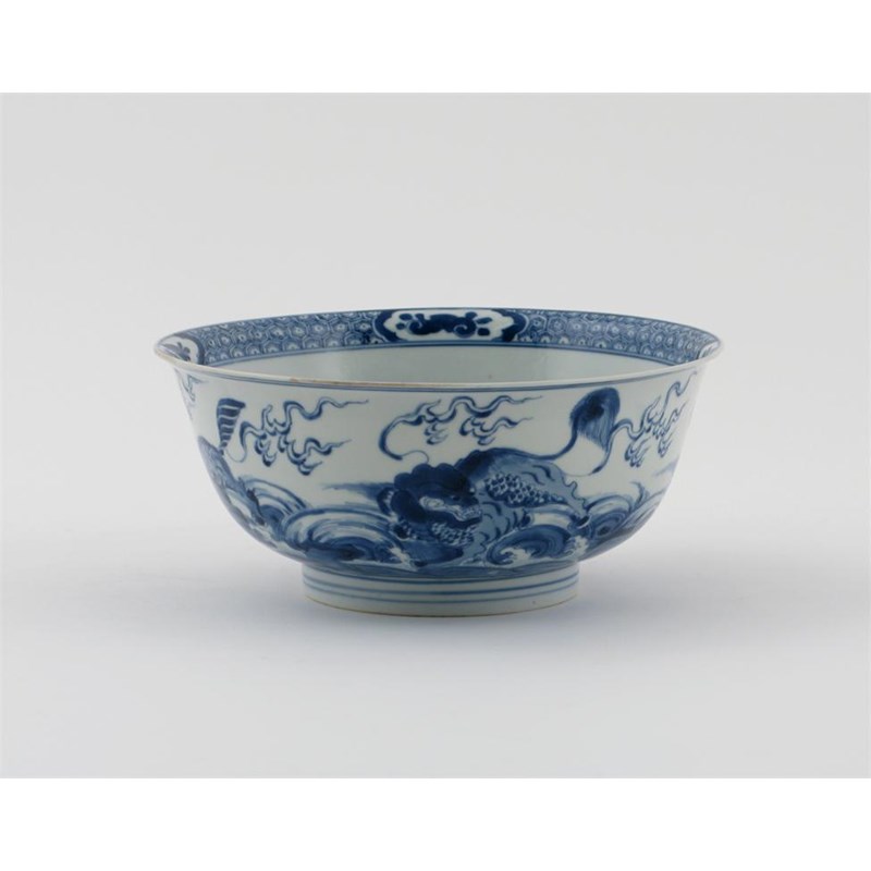 A Chinese blue and white bowl, Kangxi 1662-1722. The exterior painted with four mythical beasts riding above breaking waves, the interior with a small shell-like motif raised on waves beneath clouds and a distant moon, 18.9cm.