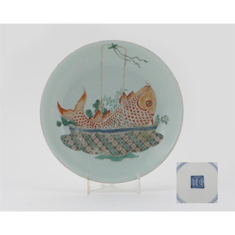 A Chinese famille verte dish, Kangxi 1662-1722. Painted with a large red carp lying in an elaborate basket, the reverse with a seal mark, a faint haircrack, 21cm.