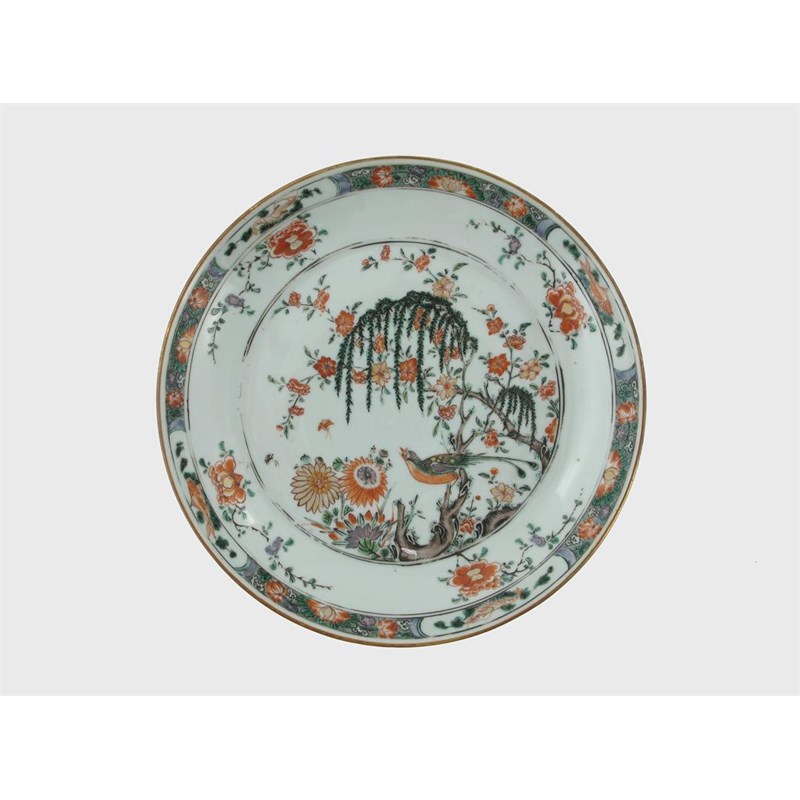 A Chinese famille verte saucer dish, Kangxi c.1700. Painted with a colourful bird perched below a willow tree amidst flowering shrubs, the border with four panels of fish and crustacea, a faint rim crack, 24.6cm.