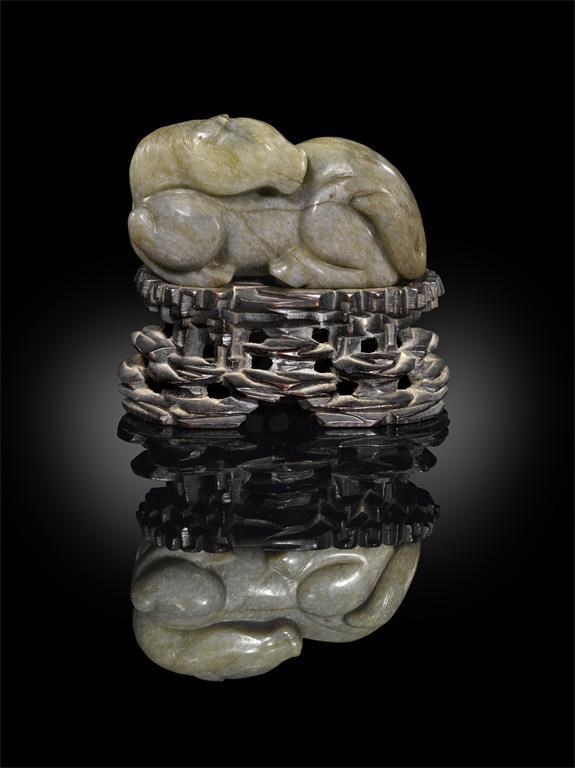 A Chinese jade model of a recumbent horse, probably late Ming dynasty. Lying with its head turned and its legs tucked beneath its body, the mane finely incised, the stone flecked with green, grey and white markings, raised on a high carved and pierced wood stand, 10cm. (2)