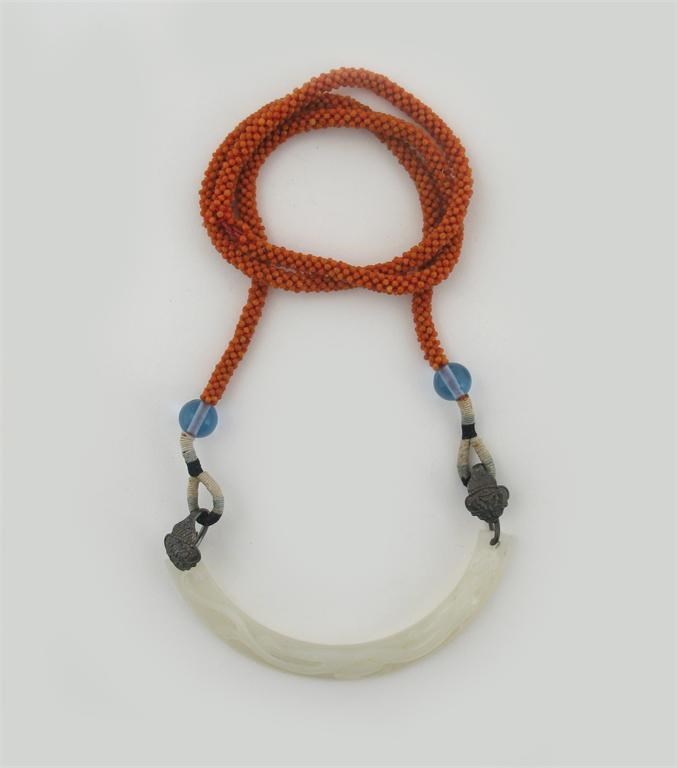 A Chinese white jade carving, 19th century. With a long sinuous chilong dragon on a semicircular bi-disc section, and mounted as a necklace with a coral bead cord, the jade 9.5cm wide.