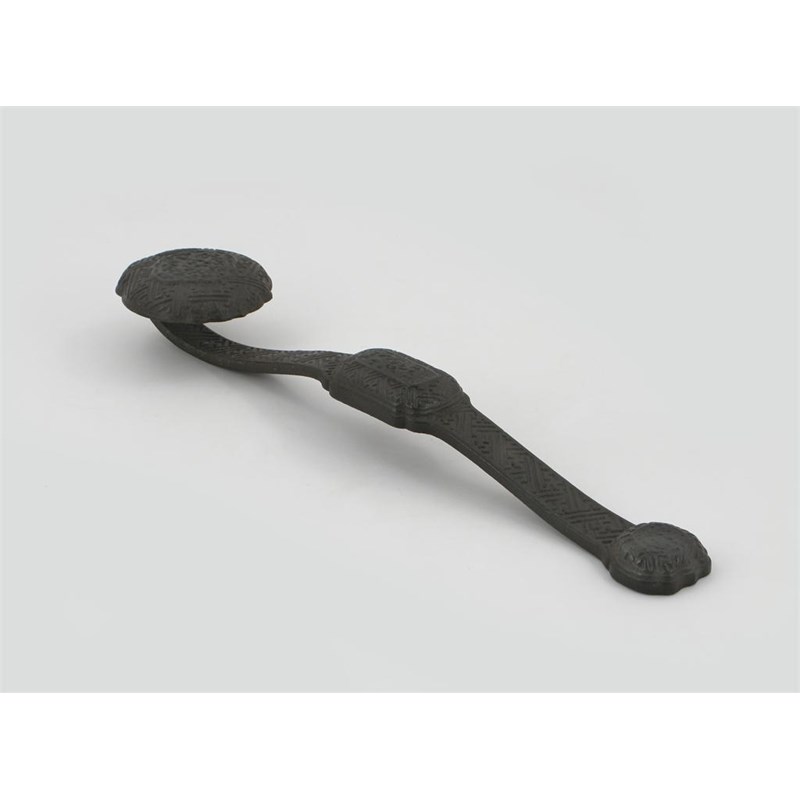 A large Chinese iron ruyi sceptre, 18th/19th century. Cast to simulate cinnabar lacquer with stylized dragons on a diaper ground, 56cm.