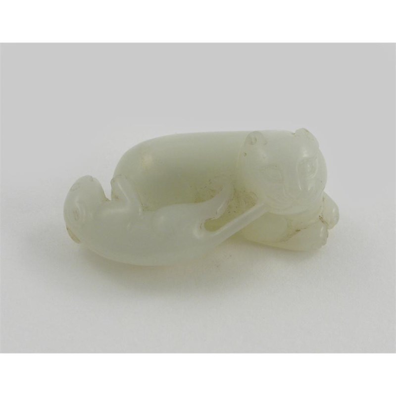 A Chinese white jade miniature carving of a recumbent cat, 18th/19th century. Holding the tail of a mouse in its jaws, 4.3cm.