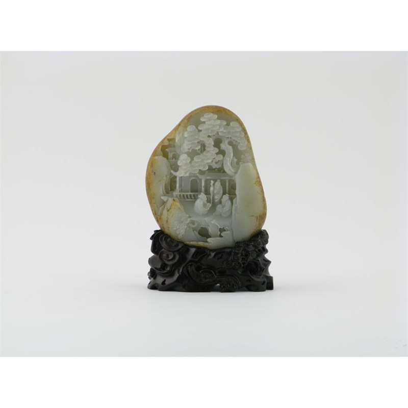 A Chinese pale celadon jade boulder carving, 19th/20th century. Depicting three figures before a pagoda beneath a tree, the reverse with a small pagoda hidden behind rocks, the stone with brown skin around the border. Raised on a carved hardwood stand. 15.5cm. (2)