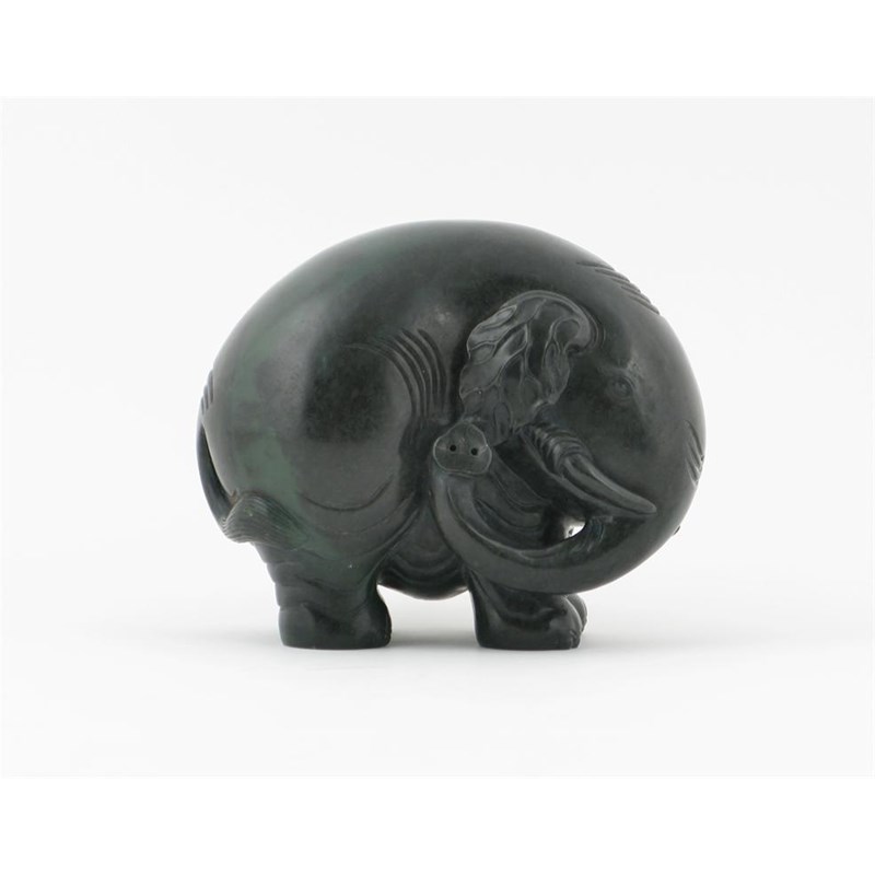 A large Chinese spinach-green jade model of an elephant, 19th century. Carved in the round with his trunk curled round to the right and touching his ear, standing four square with stylized folds to his skin and his ears deeply veined, 16cm long, 13.5cm high.