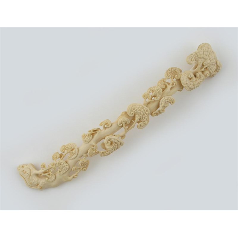 A Chinese ivory ruyi sceptre, 19th century. Elaborately carved with an abundance of lingzhi fungus growing from a gnarled stem, 30.5cm.