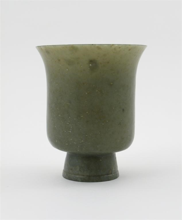 A Chinese jade stem bowl, Ming dynasty 16th/17th century. With a flared U-shaped bowl and a tall cylindrical foot, the stone speckled greenish-grey, 12.8cm.