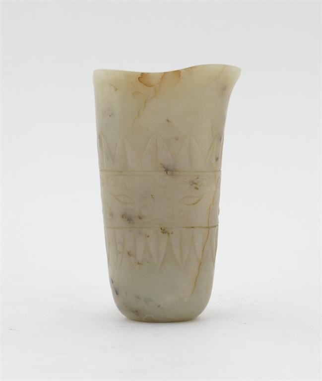 A Chinese celadon jade rhyton, probably 17th century. Carved with a central taotie band between stiff leaves, the stone flecked with darker inclusions, 10.5cm.