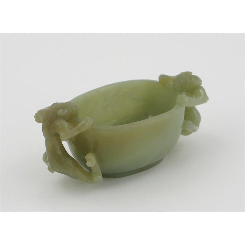 A Chinese yellow jade oval cup, 18th century. With two dragon handles, each with their heads looking over the rim, 9.5cm.