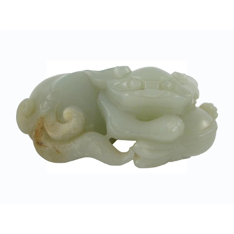 A Chinese pale celadon jade carving of a recumbent Buddhist lion dog, probably Qianlong. Clutching a ball in its front paws, his mane and tail finely detailed, 8cm.