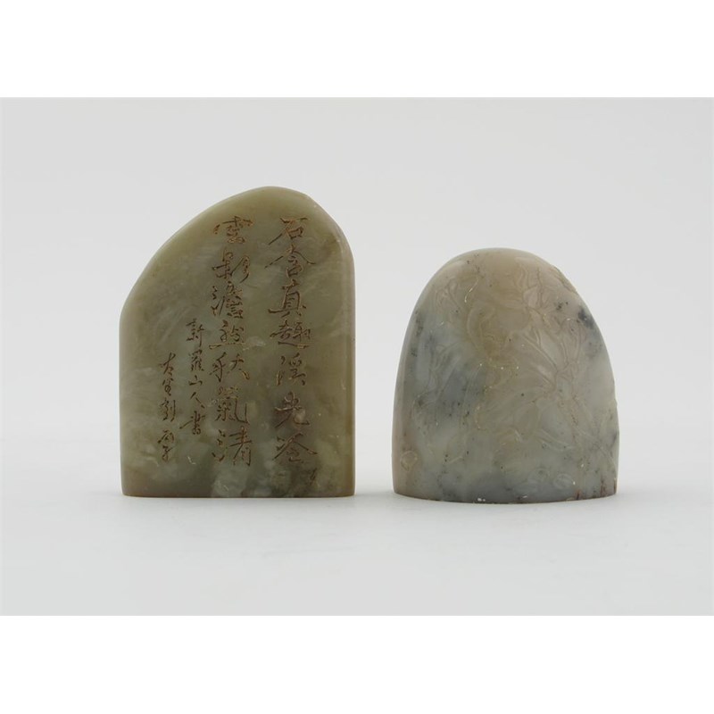 Two Chinese soapstone seals, 19th century. Both carved with lotus, the larger with four lines of calligraphy to the reverse, 7.4cm. (2)