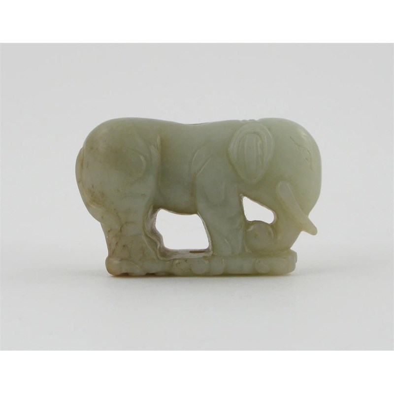 A Chinese celadon jade carving of a elephant, 18th century. Standing on a cloud, scroll base, the stone with russet markings, 5.3cm.