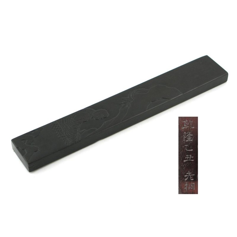 A dated Chinese zitan wrist rest or scroll weight, six character mark including the date corresponding to 1745. Carved in shallow relief with a Luohan seated beneath a rocky outcrop from which a lingzhi fungus grows, 31.6cm.