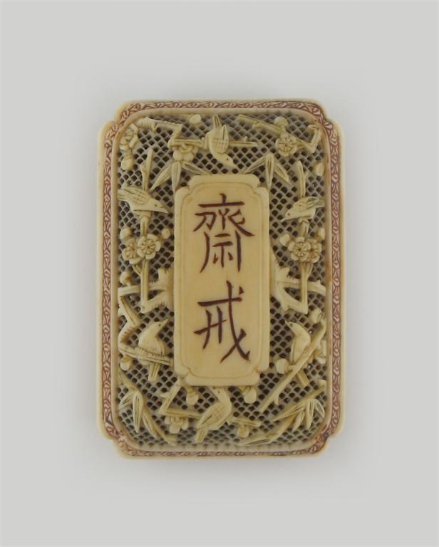A rare Chinese ivory abstinence pendant, 18th century. Constructed as a reticulated rectangular box, finely carved with birds perched on prunus, on side with the characters zhai jie in Chinese, the other side with bolgomi karga in Manchu characters, 6cm. (2)