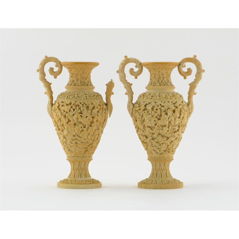 A rare pair of large Chinese Canton carved ivory urn-shaped vases, 19th century. Deeply carved with warriors in a landscape amidst flowers, foliage and pagodas, the necks, shoulders and feet carved with continuous flower scrolls, the handles carved as scrolling foliage, with one handle damaged, other small faults, 28.5cm. (2)
