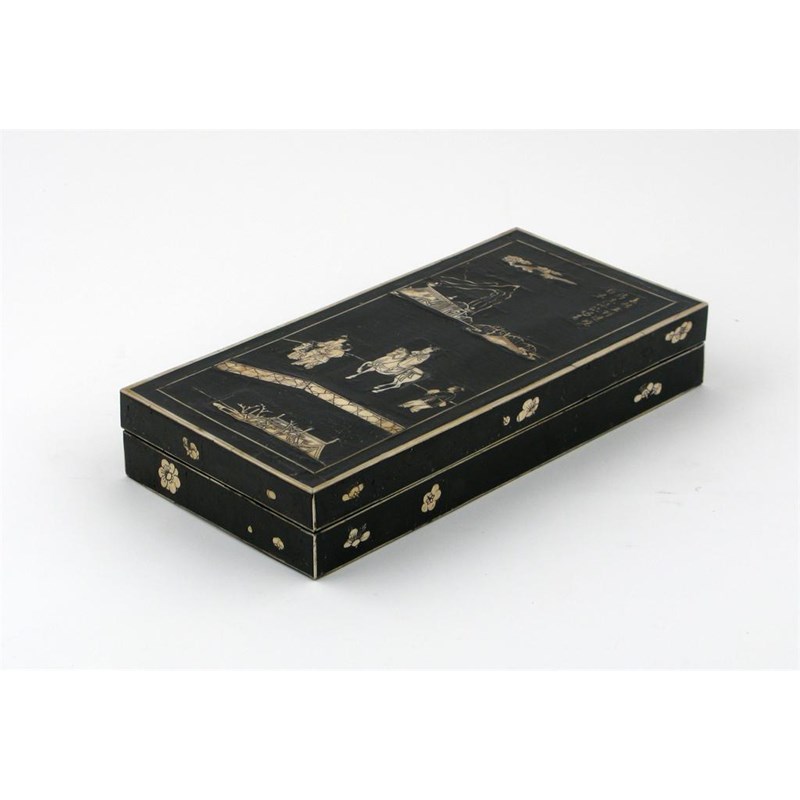 A Chinese black lacquer and ivory-inlaid box and cover, 17th century. Depicting and equestrian figure and three attendants on a bridge, in a watery mountainous landscape, beneath ruyi clouds and three lines of calligraphy, the sides with prunus flowerheads, old restoration, 33.5cm. (2)