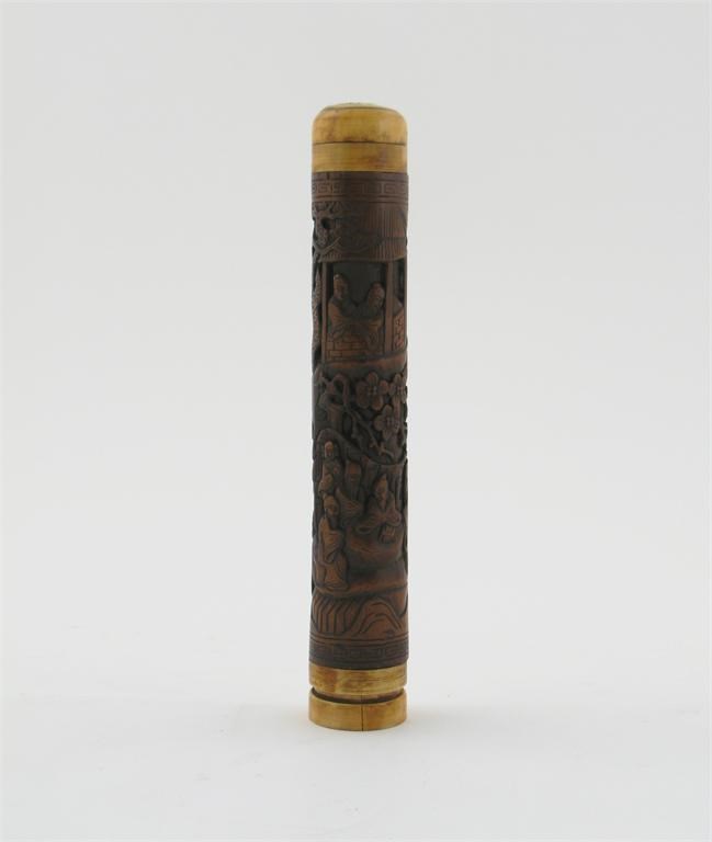 A Chinese bamboo and ivory perfume holder, 17th / 18th century. The cylindrical body carved with figures at leisure in buildings, beneath prunus and beside a bamboo grove, the borders with key fret bands, one end pierced, 20.3cm. (2)