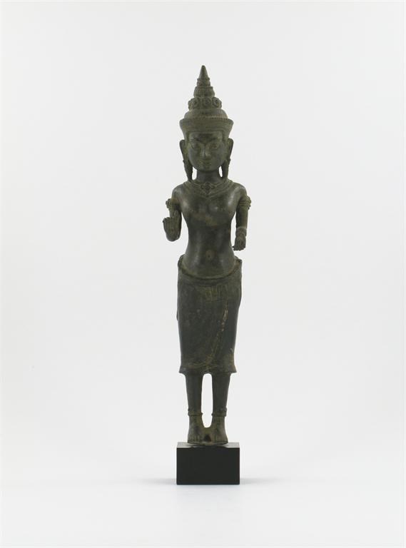 A Khmer Lopburi bronze figure of Uma, c.13th century. Standing wearing a sampot, her hands extended holding a lotus flower, 40cm.