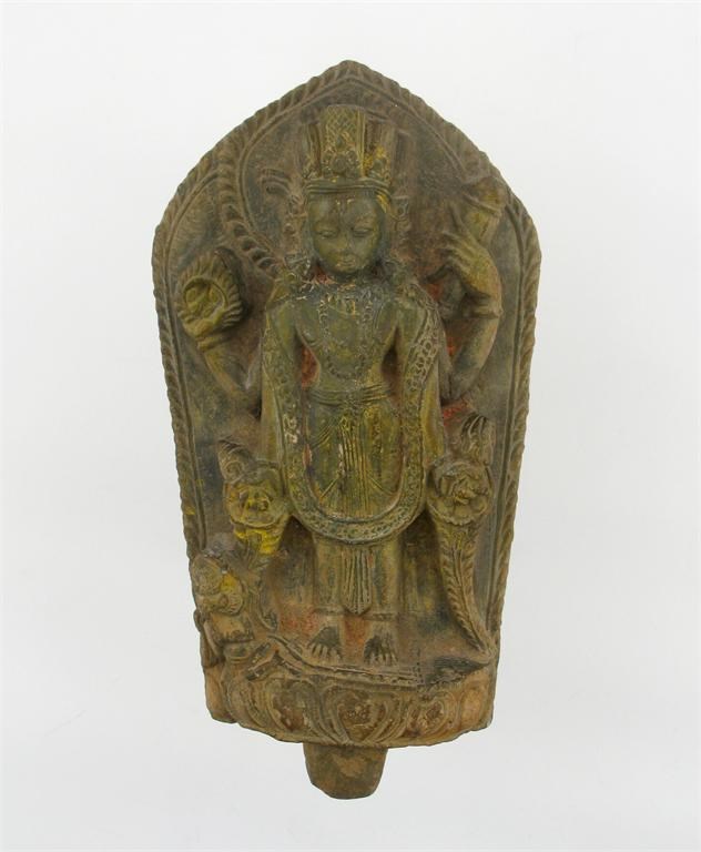 A Nepalese stone stele of Vishnu, c.17th century. Standing on a lotus throne, holding a chakra, shanka, padma and a chamara, a small figure of Garuda at his feet, traces of cold paint, 26cm.