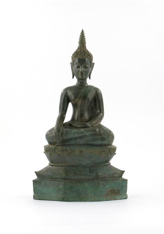 A Thai Chienseng bronze figure of Buddha, probably 16th century. Seated in dhyanasana, his hands in bhumisparsa and dhyana mudra, raised on a lotus throne and stepped triangular plinth, 40.5cm.
