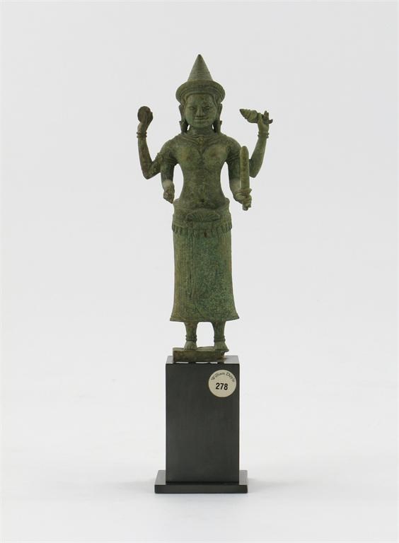 A Khmer bronze standing figure of Uma, 12th / 13th century. Holding a sankha and a bhu, wearing a vertically striated sampot secured by a belt, raised on a rectangular base, the surface with a green patination, 21.4cm.