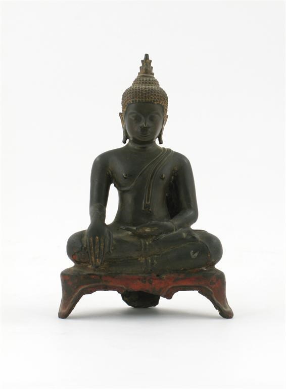 A Thai Chienseng bronze figure of Buddha, 15th / 16th century. Seated in sattvasana on a footed base, with hands in bhumisparsa and dhyana mudra, with traces of gilding and lacquer, 25.5cm.