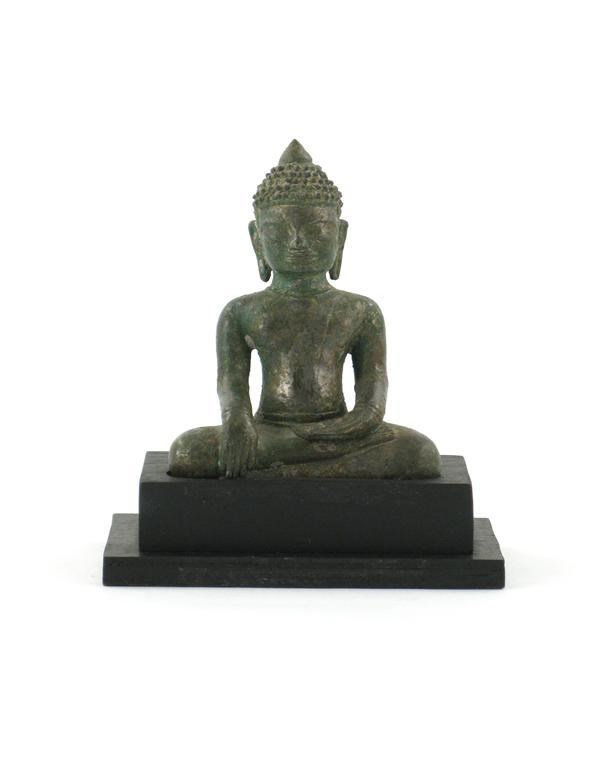 A Thai Lopburi bronze figure of Buddha, probably 13th century. Seated in dhyanasana, his hands in bhumisparsa and dhyana mudra, traces of green patination, together with a wood stand, 11.2cm. (2)