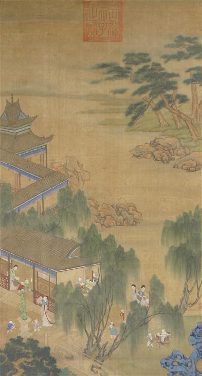 A Chinese painting on silk, depicting young ladies and children enjoying everyday pursuits in a pavilion and on a terrace beneath willow trees, in an extensive rocky landscape with distant pine, a red seal mark to the top, signed with two smaller seal marks to the bottom left, damage and restoration, 102cm x 54cm. Mounted on a board.