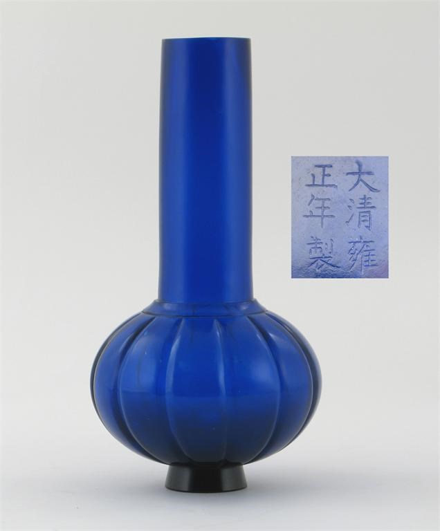 A Chinese Beijing glass bottle vase, six character Yongzheng mark. The tall neck issuing from a lobed globular base, 30cm.