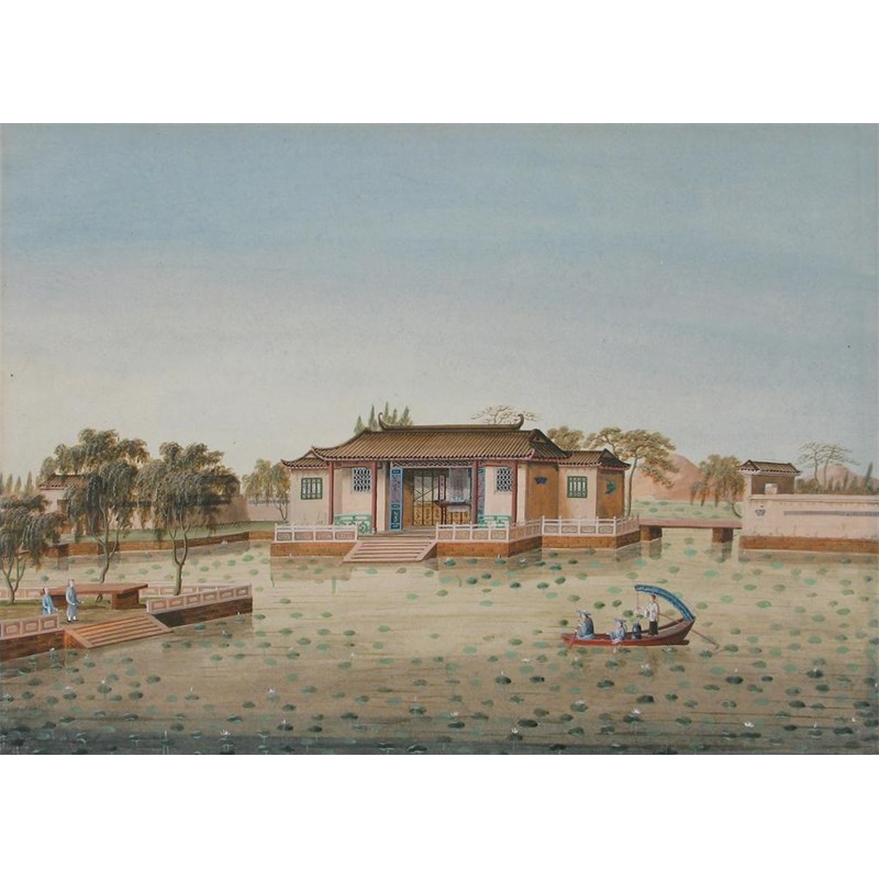 A Chinese export painting on paper, c.1780. Depicting figures in a small boat before a building, 30.5cm x 43cm.
