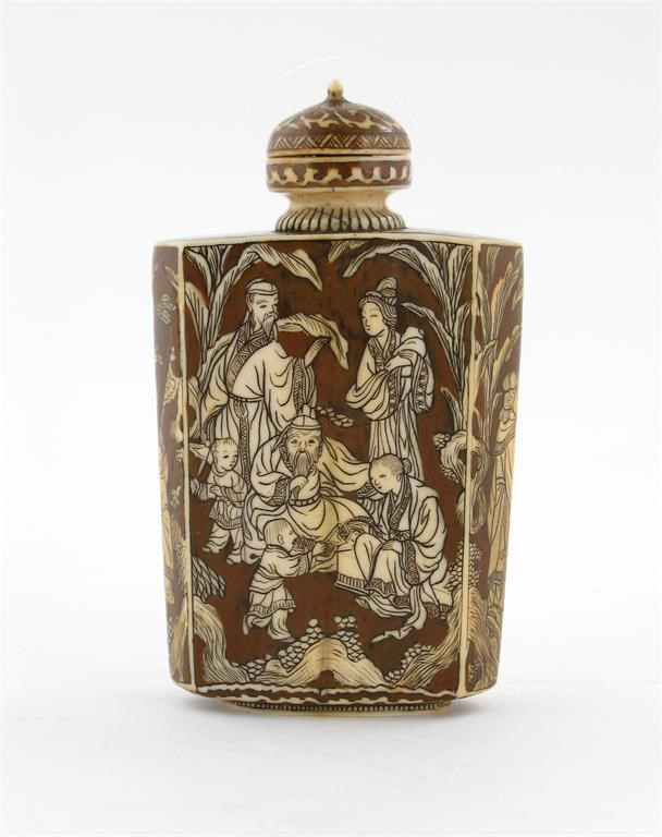 An ivory snuff bottle, four character Qianlong mark but probably later. Each side decorated with figures including many children amidst flowers and foliage, finely detailed in pen work on a brown ground, 9cm.