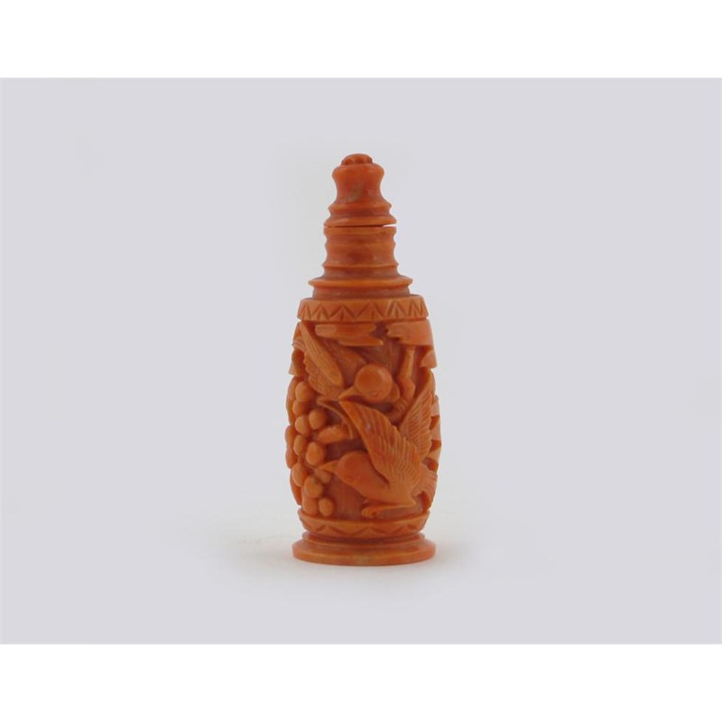 A Chinese coral snuff bottle, 19th / 20th century. The cylindrical body carved with birds amidst fruit and foliage, 6.5cm.