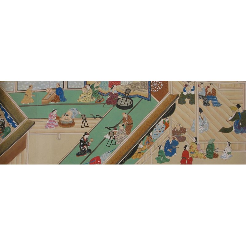 A hand scroll, 19th century. Brightly painted with figures enjoying everyday pursuits, the borders gilded, 774cm x 23cm.