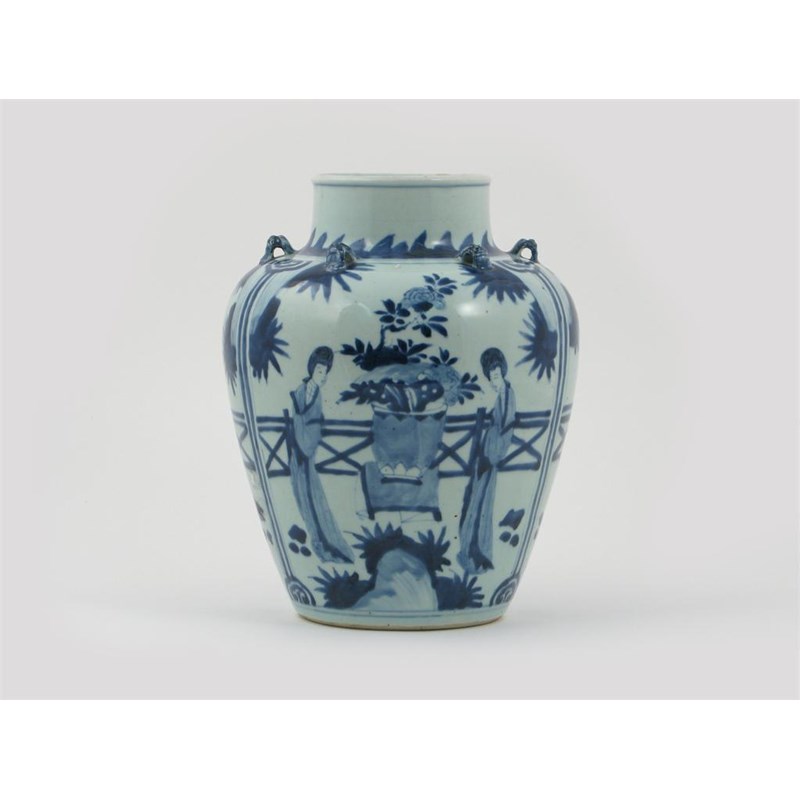 A Chinese blue and white vase, 17th century. The shoulder with six loop handles, the body painted with six slender maidens divided by vases of flowers, 5cm rim crack, 30cm.