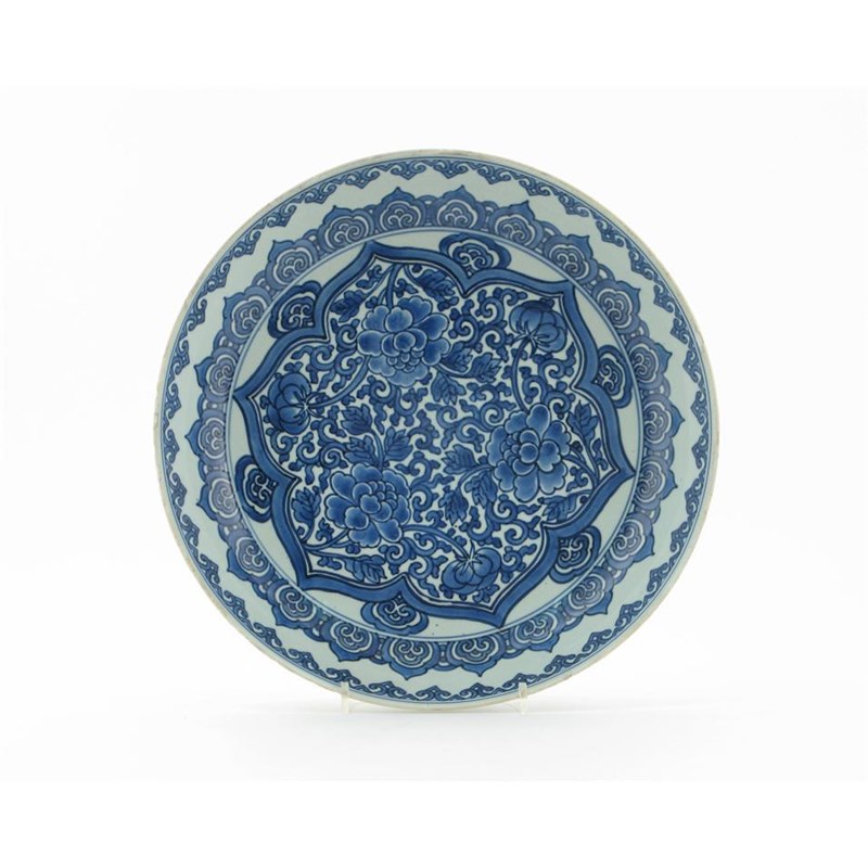 A large Chinese blue and white dish, late 17th century. Painted with a large peony panel, within a border of ruyi heads, the foot with a channelled rim, small rim chips, 34.5cm.